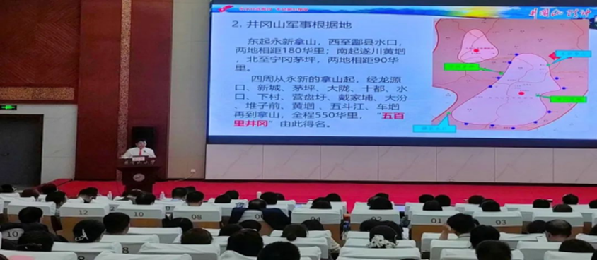 红色资源与大中小学思政课高度契合,是各学段思政课不可或缺的教学内容,是新时代思政课改革创新的必然趋势。为充分用好井冈山红色资源,开辟思政课育人新途径,本次培训班设置专题教学环节,教育部人文社会科学重点研究基地“井冈山大学中国共产党革命精神与文化资源研究中心”主任、井冈山大学原校长张泰城教授,中心副主任、井冈山大学井冈山研究中心主任肖发生分别作了题为《学习贯彻习近平新时代中国特色社会主义思想——红色文化资源与高校人才培养》《学习贯彻党的二十大精神——传承红色基因 赓续红色血脉,井冈山斗争与井冈山精神》的专题讲座。讲座生动展现了井冈山革命斗争的历史风云,并紧密结合井冈山精神内涵,针对红色文化资源融入思政课教学做了深入阐释。