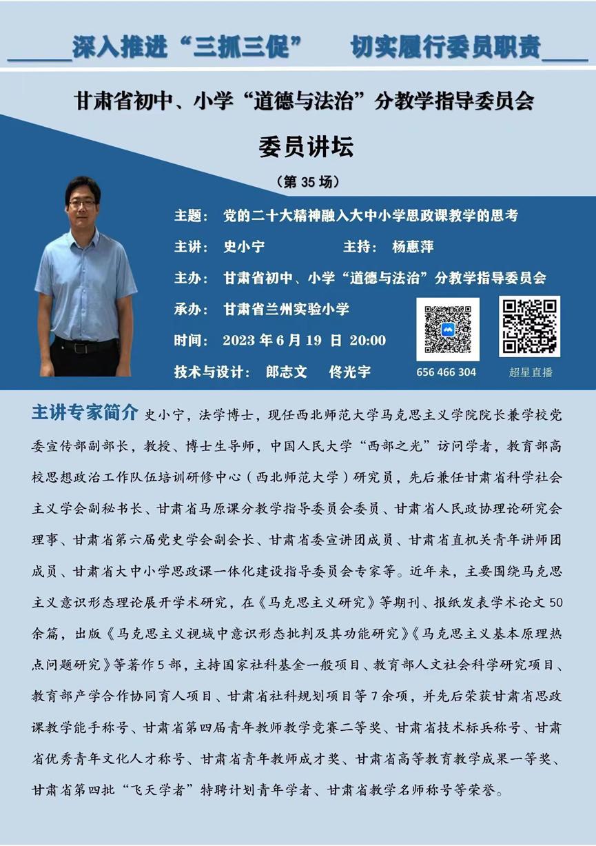 近日,甘肃省初中、小学“道德与法治”分教学指导委员会“委员讲坛”第35期开讲,旨在引领全省思政课教师在更加宽广的视域中深入理解党的二十大精神的内涵,精准把握其外延,把理论体系转化为价值体系,培养中小学生做时代新人的信心与底气。