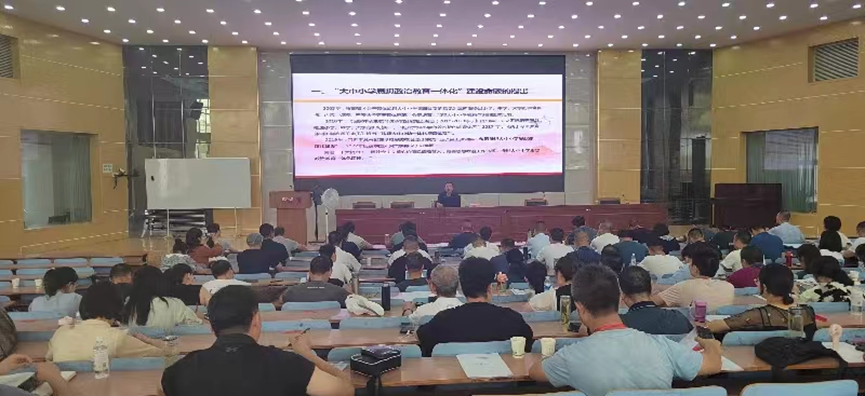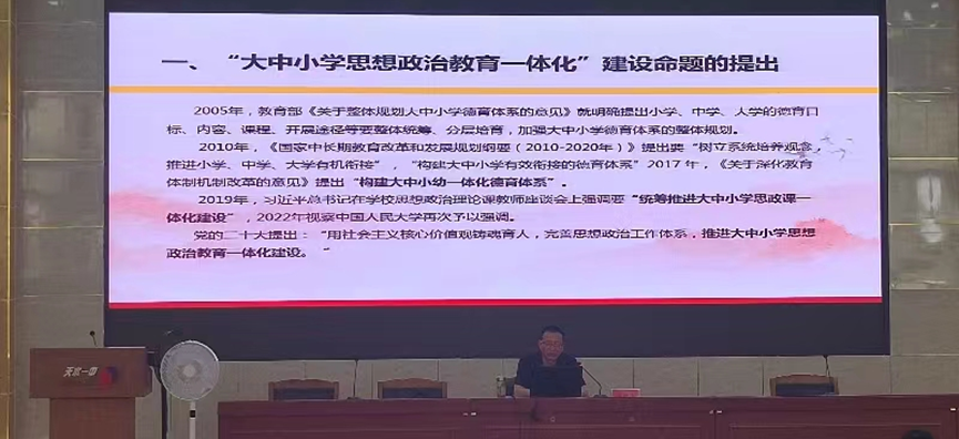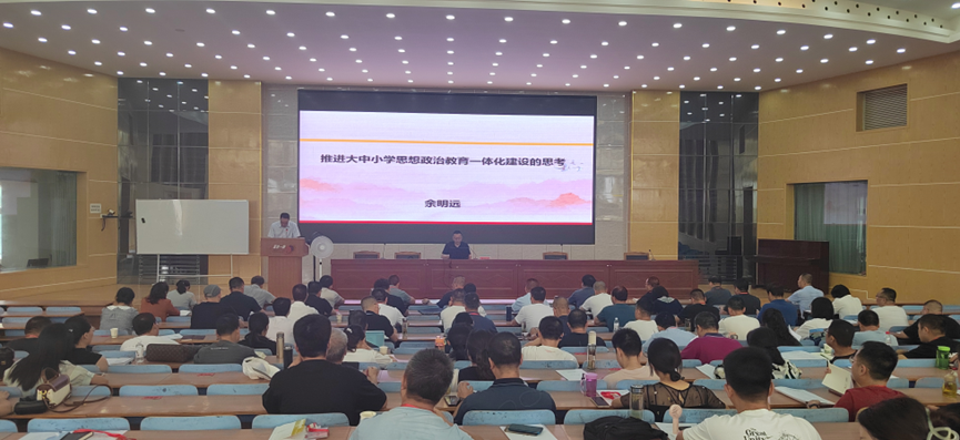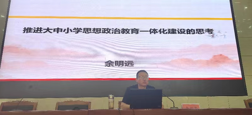 省级思政课名师工作室主持人余明远教授应邀作了《推进大中小学思想政治教育一体化建设的思考》的学术讲座。讲座对“大中小学德育一体化”“大中小学思政课一体化”“大中小学思想政治教育一体化”三个命题提出的历史背景与内涵外延进行全面比较,并围绕大中小学思想政治教育一体化建设的推进路径、应把握的关键点、实践中存在的误区等方面内容,理论结合实际,进行了深入系统的论述。