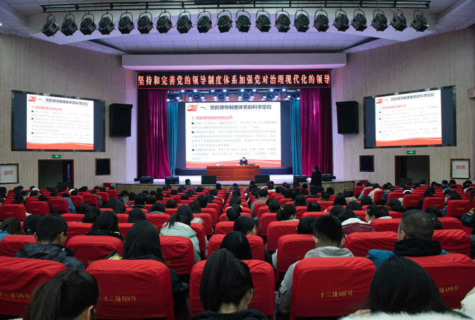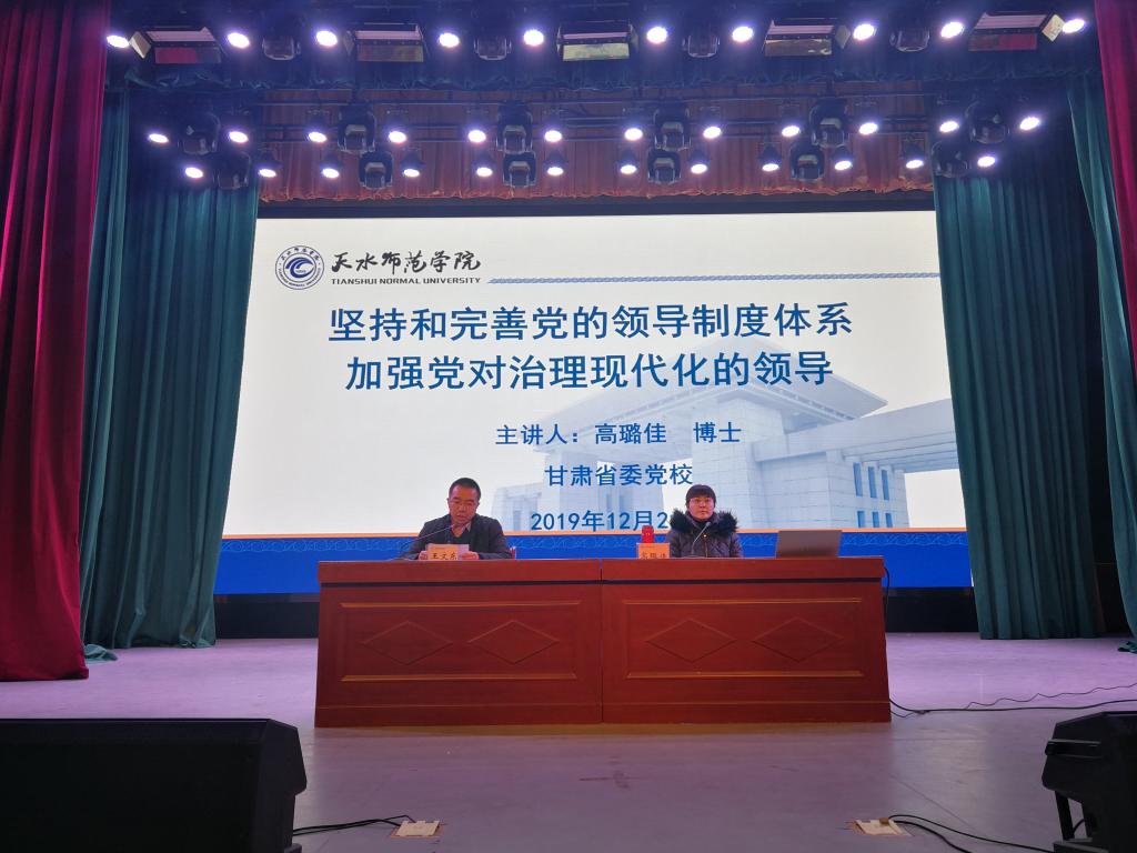 应陇东南红色文化研究院、学院邀请,12月21日上午,甘肃省委党校党的建设和领导科学教研部高璐佳博士在大礼堂作了题为《坚持和完善党的领导制度体系加强党对治理现代化的领导》的专题报告,报告会由陇东南红色文化研究院、学院和校团委共同举办,王文东副校长主持,学校近500余名师生聆听报告会。